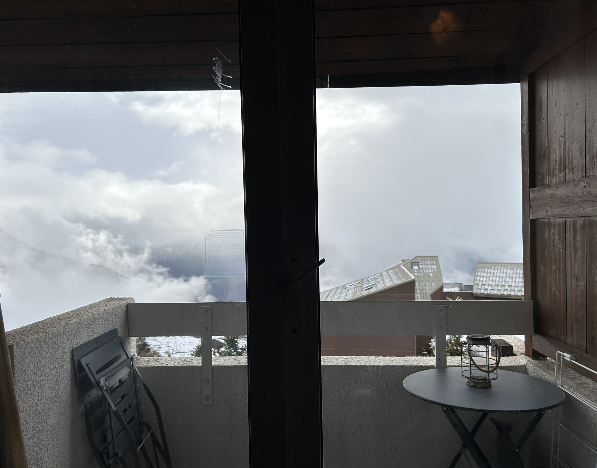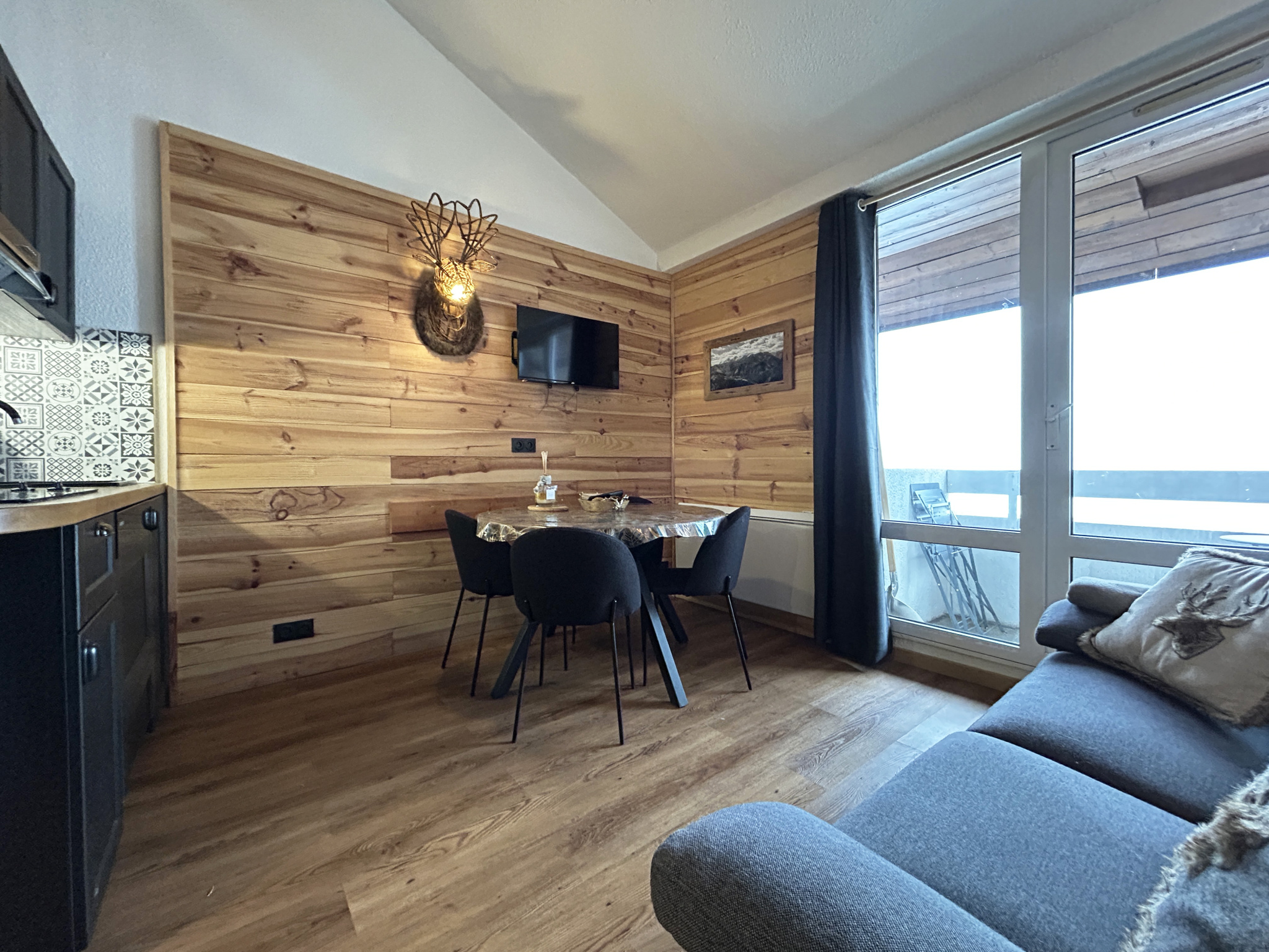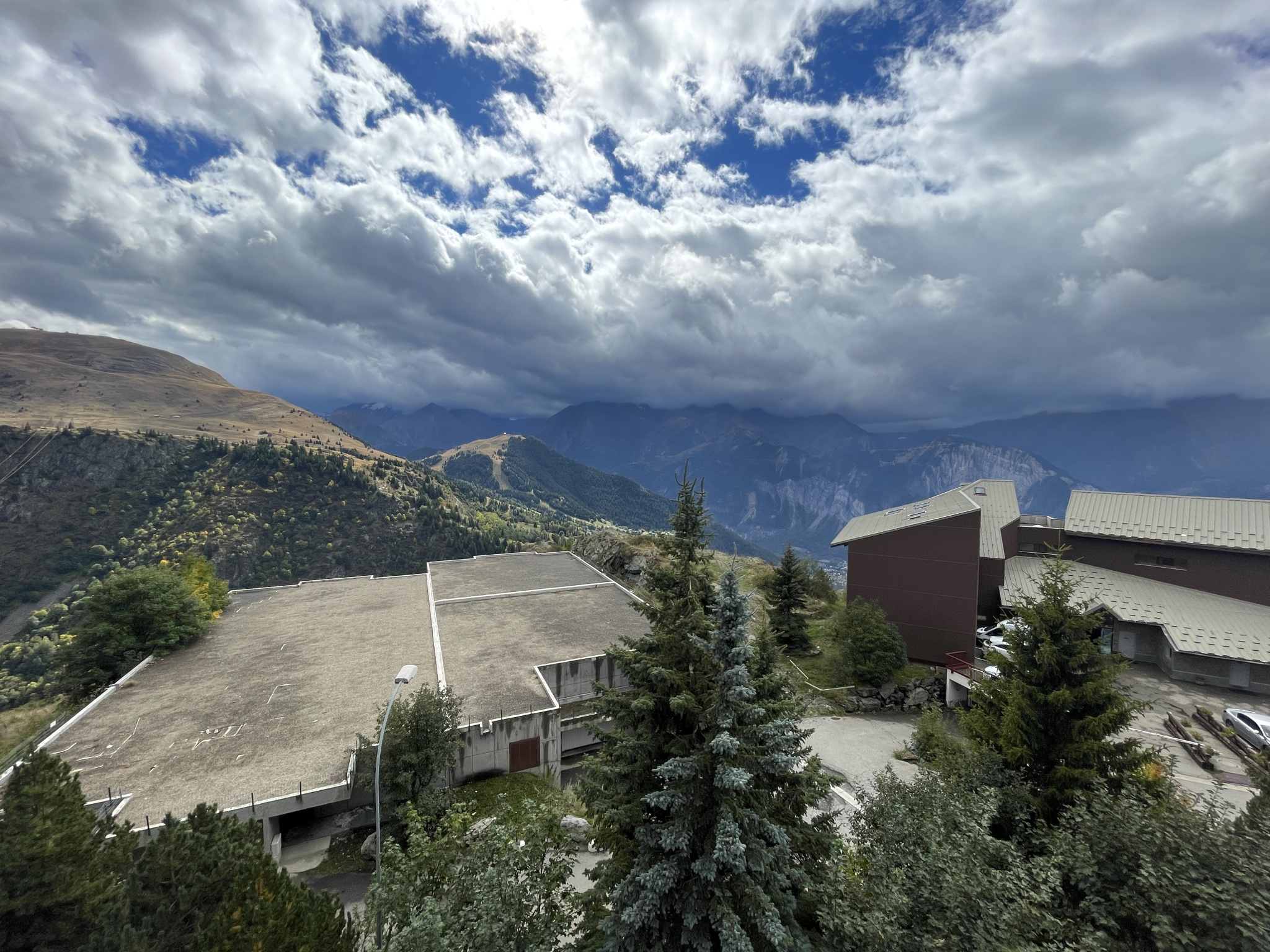 Il offre une pièce de vie lumineuse ouverte sur un balcon, aux vues exceptionnelles sur les montagnes et plein Sud.