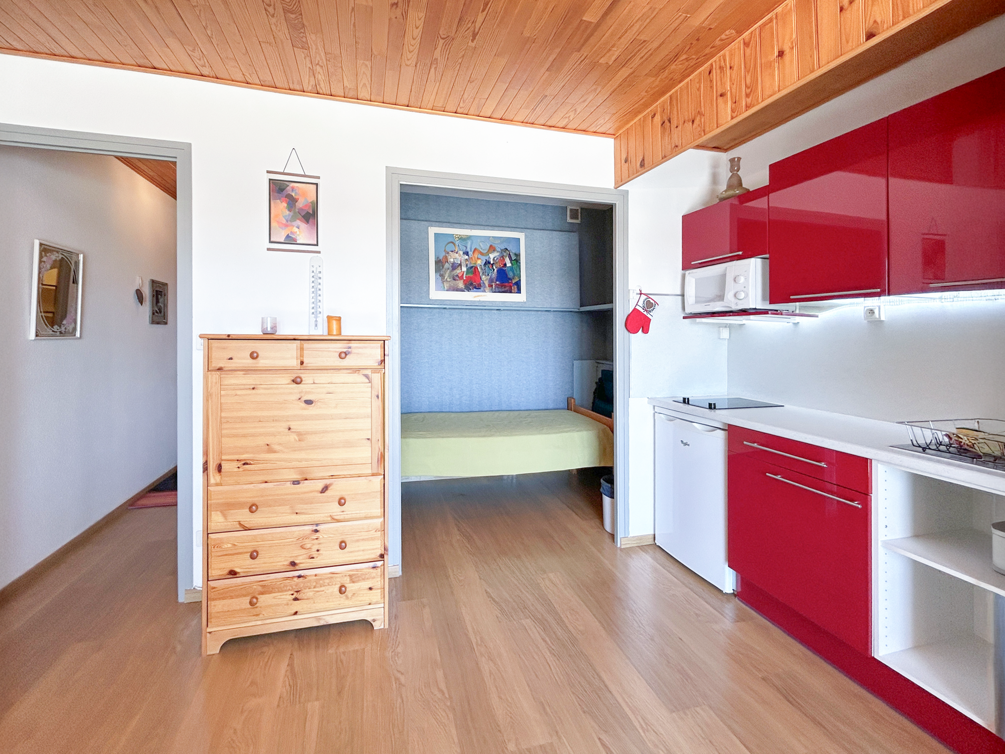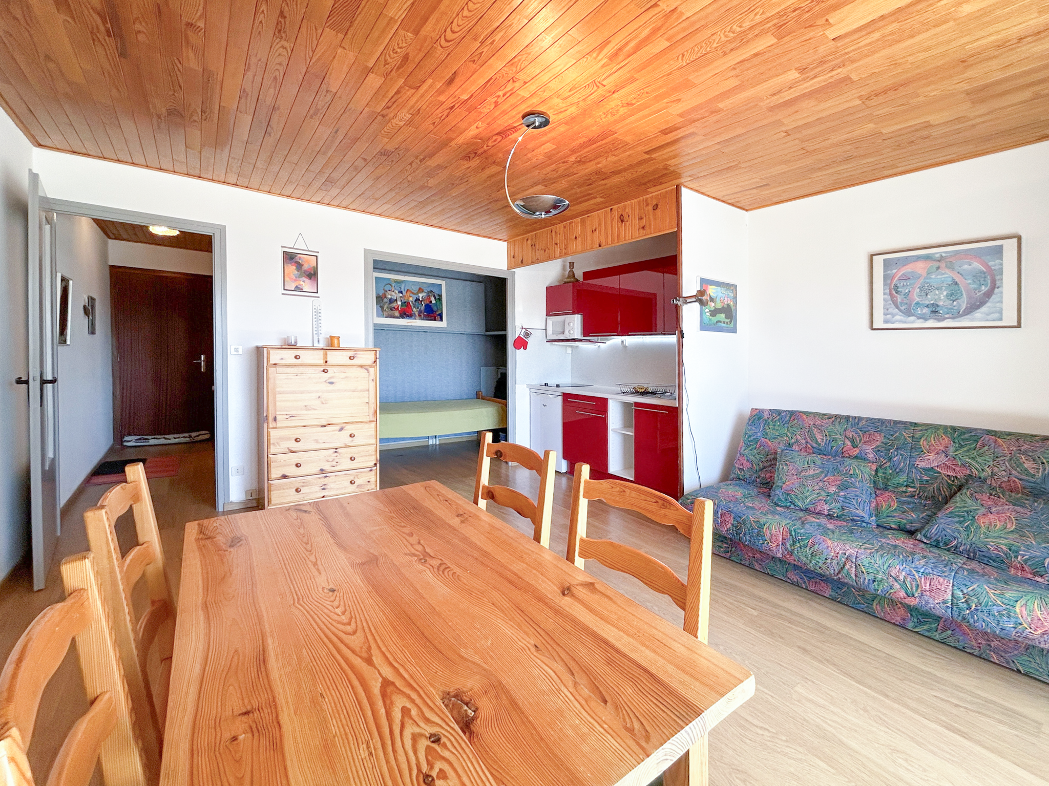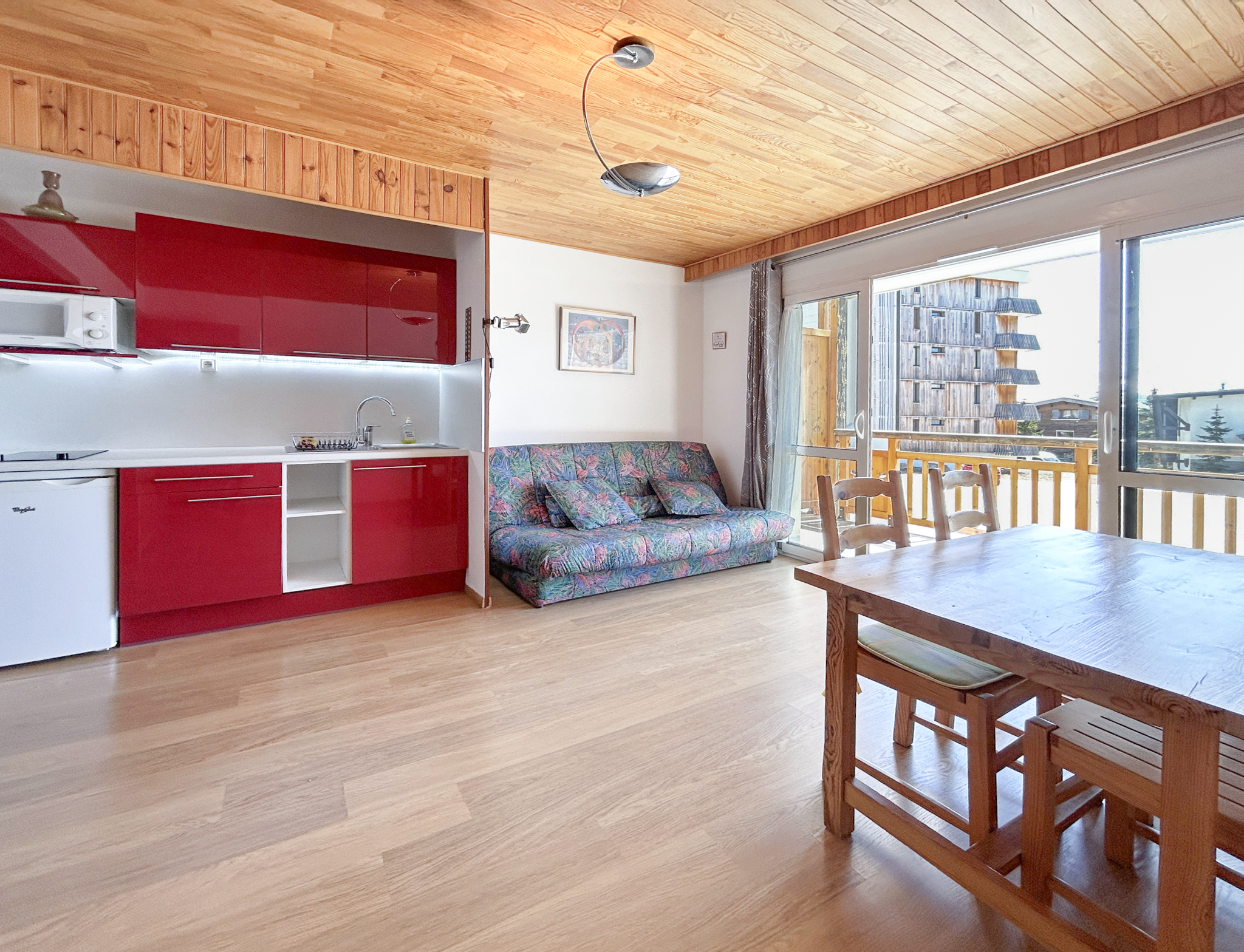 Idéalement situé en centre station et juste à côté des pistes de skis, cet appartement de 30m2 offre une belle pièce de vie exposée plein Sud et très lumineuse s’ouvrant sur une grande terrasse confortable vue montagne.