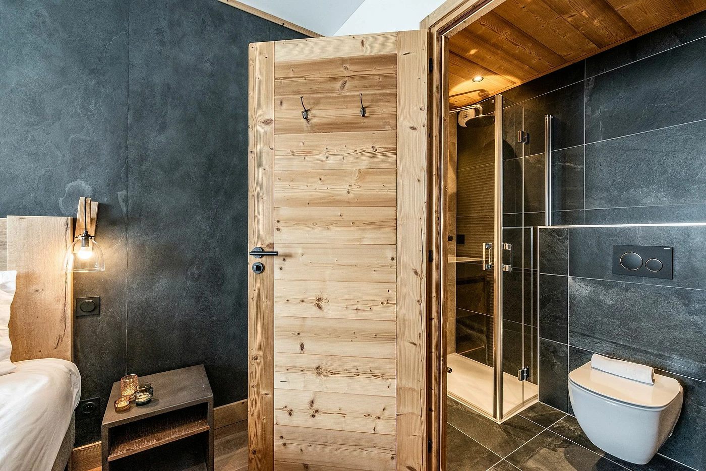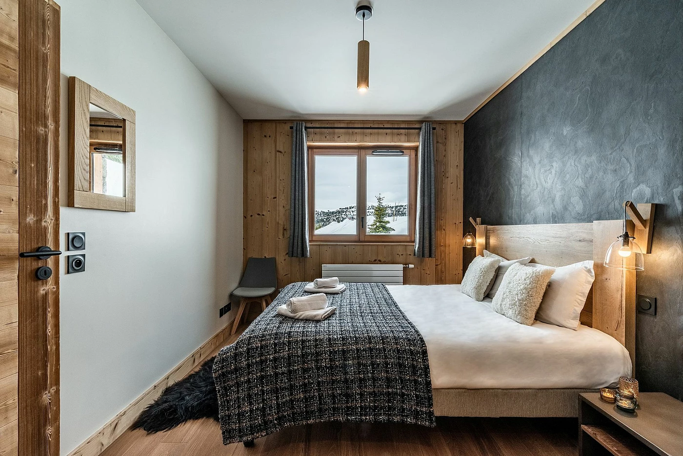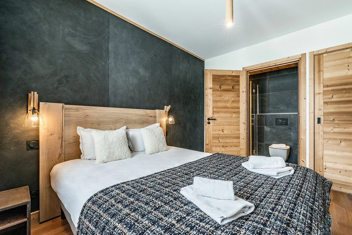 L’appartement offre 1 chambre avec salle de bain privative, ainsi qu’un coin nuit fermé équipé de lits superposés.