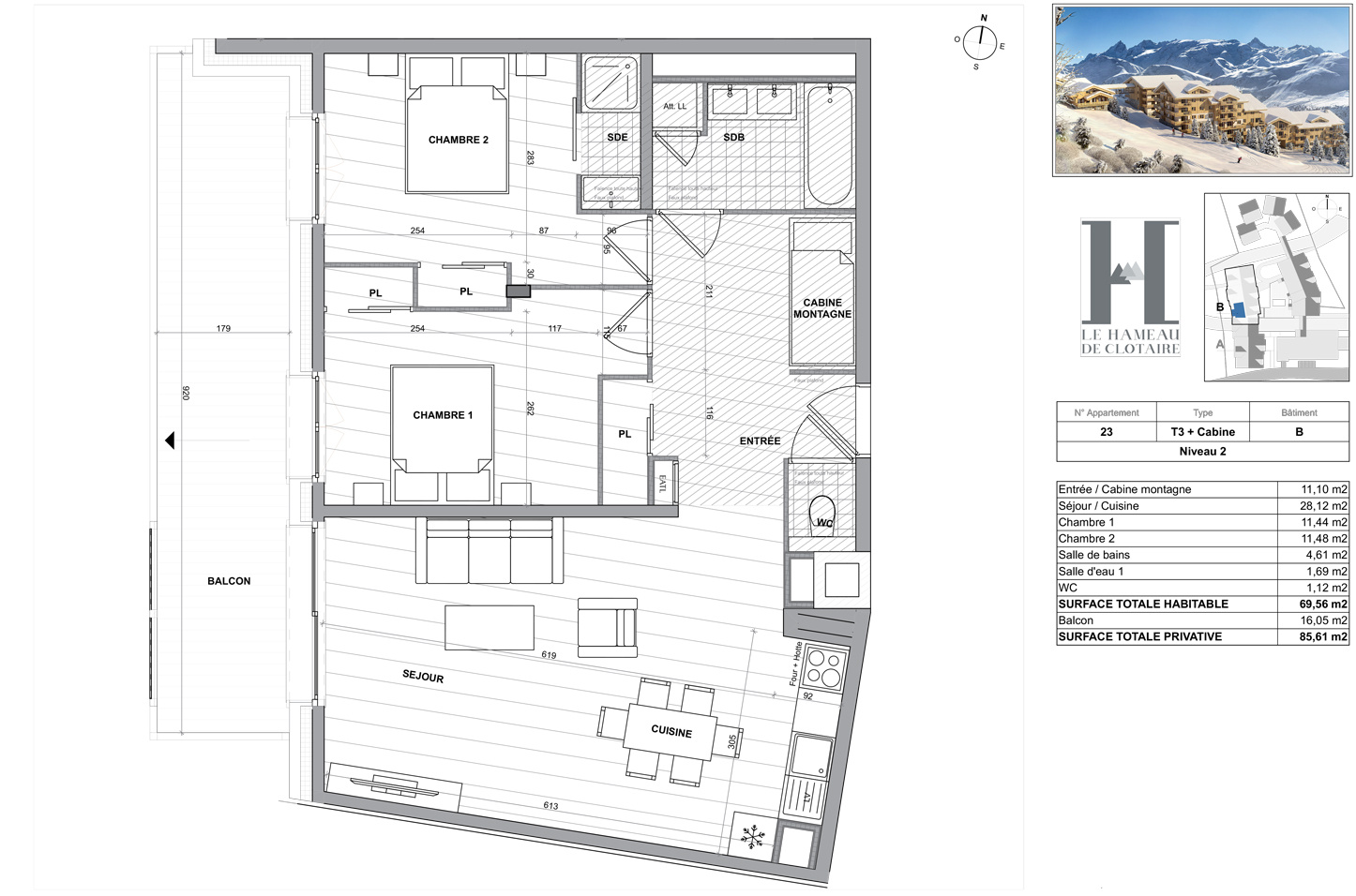 Ce dernier possède 2 chambres et un coin montagne, 2 salles de bain, toilettes séparées.