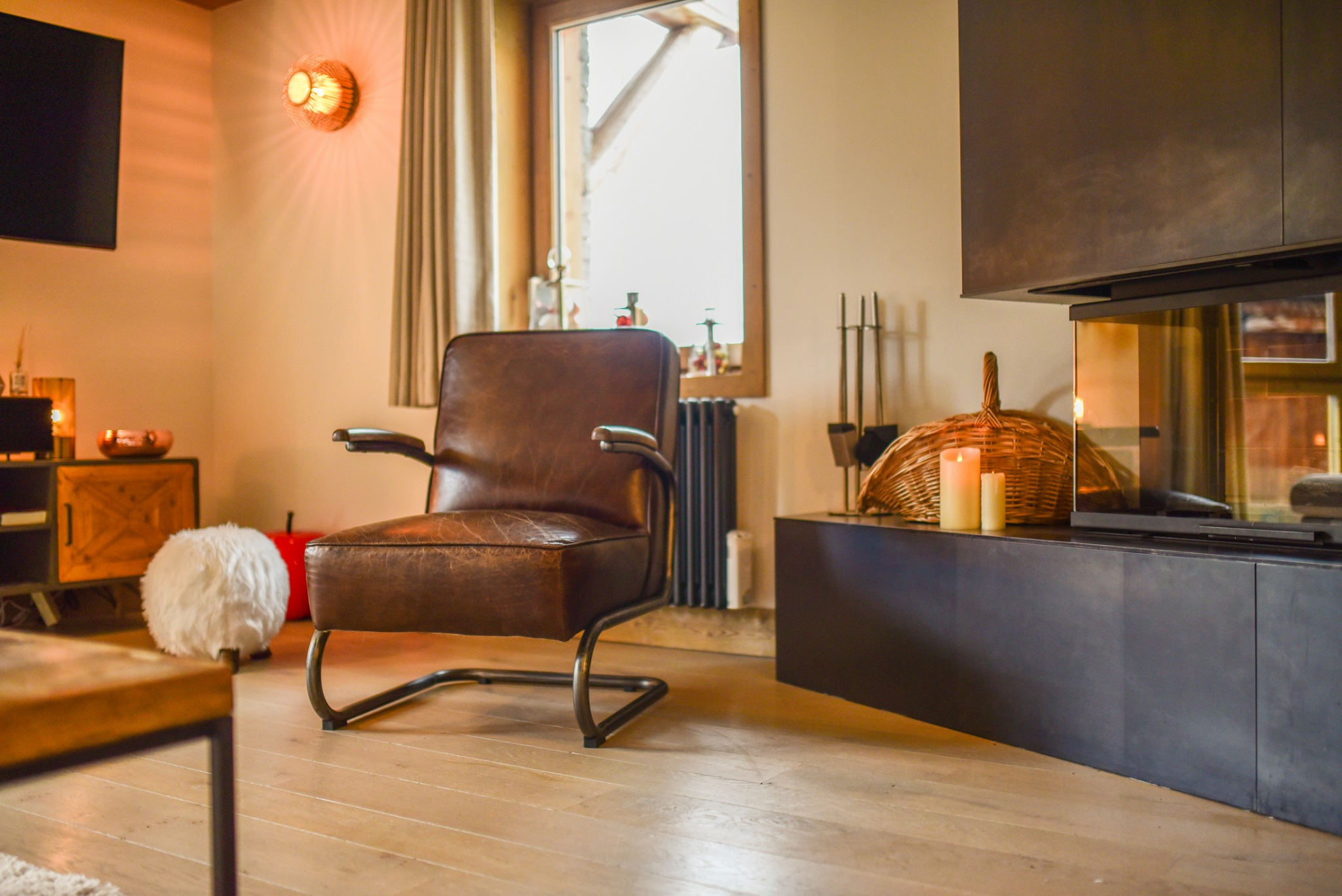 Grand séjour de 40 m2 avec cuisine ouverte exposé Sud/Ouest offrant une cheminée pour les longues soirées d’hiver.