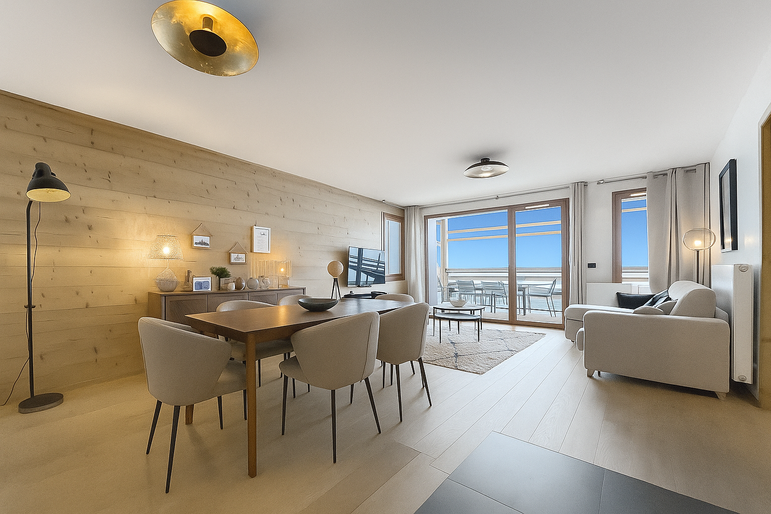 Vendu entièrement meublé dans une décoration raffinée, il allie confort moderne et ambiance chaleureuse de montagne, parfait pour accueillir famille et amis.
