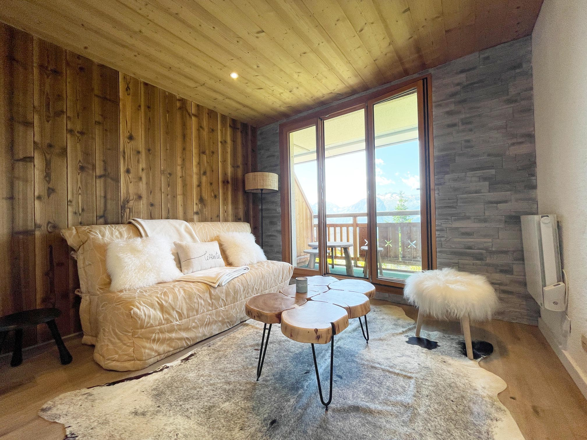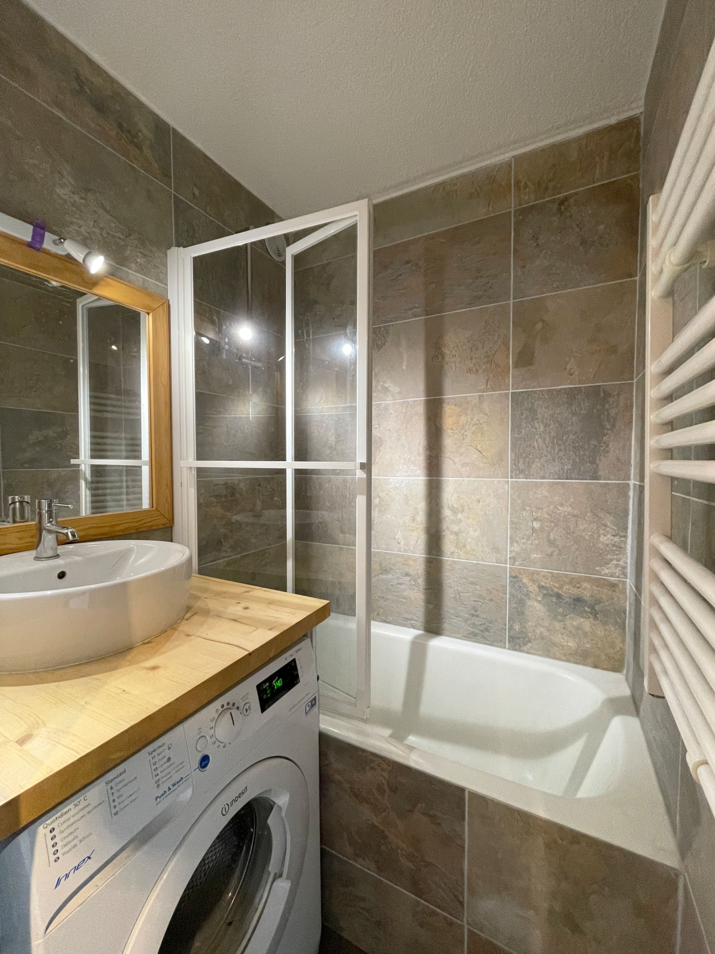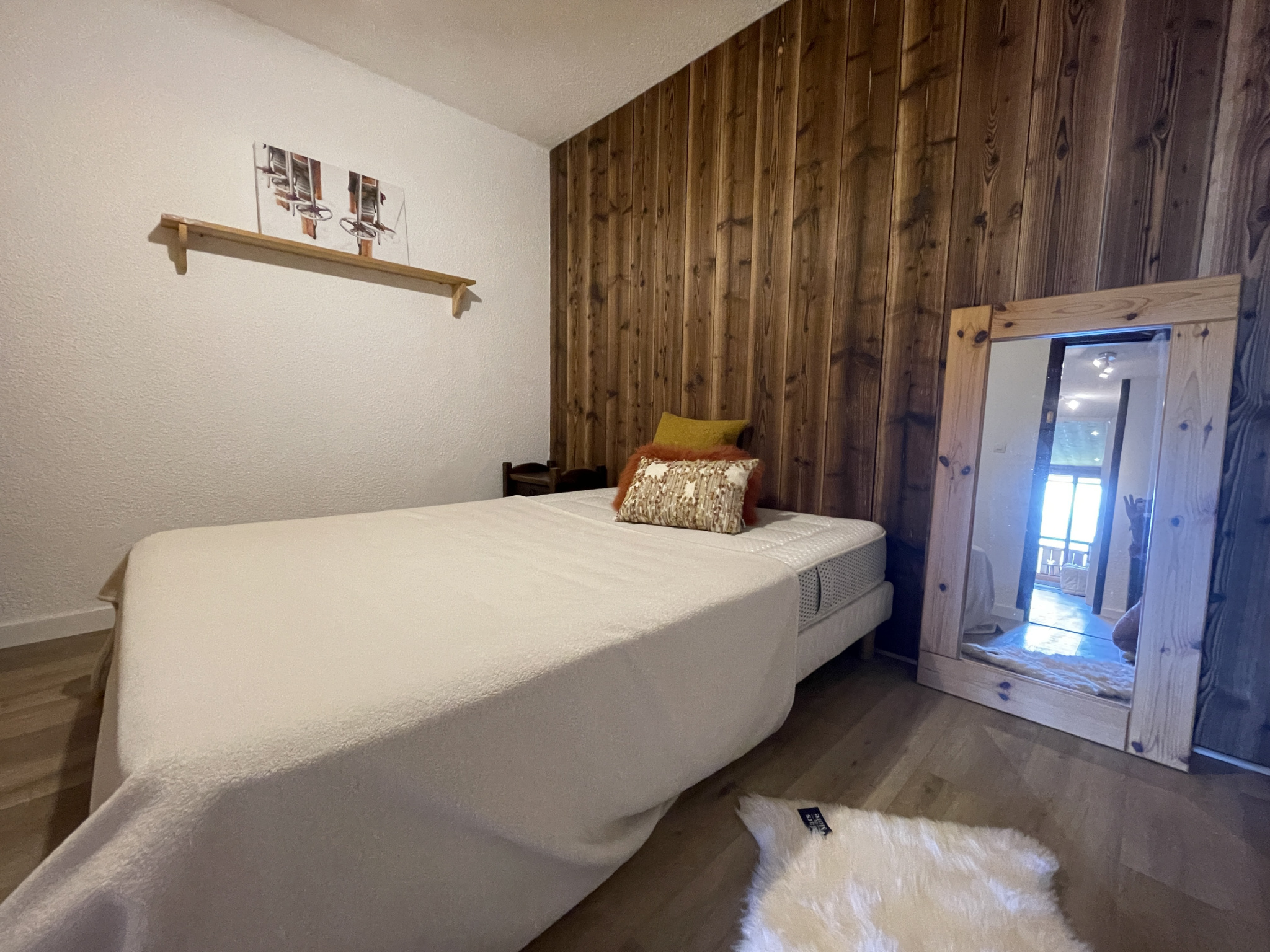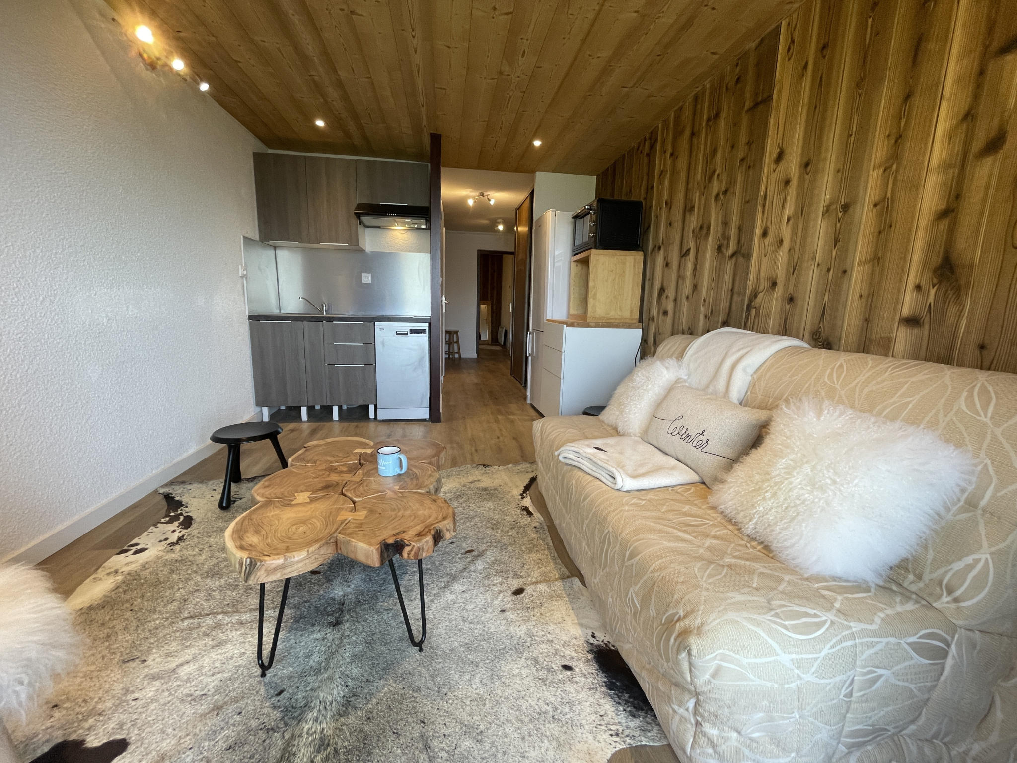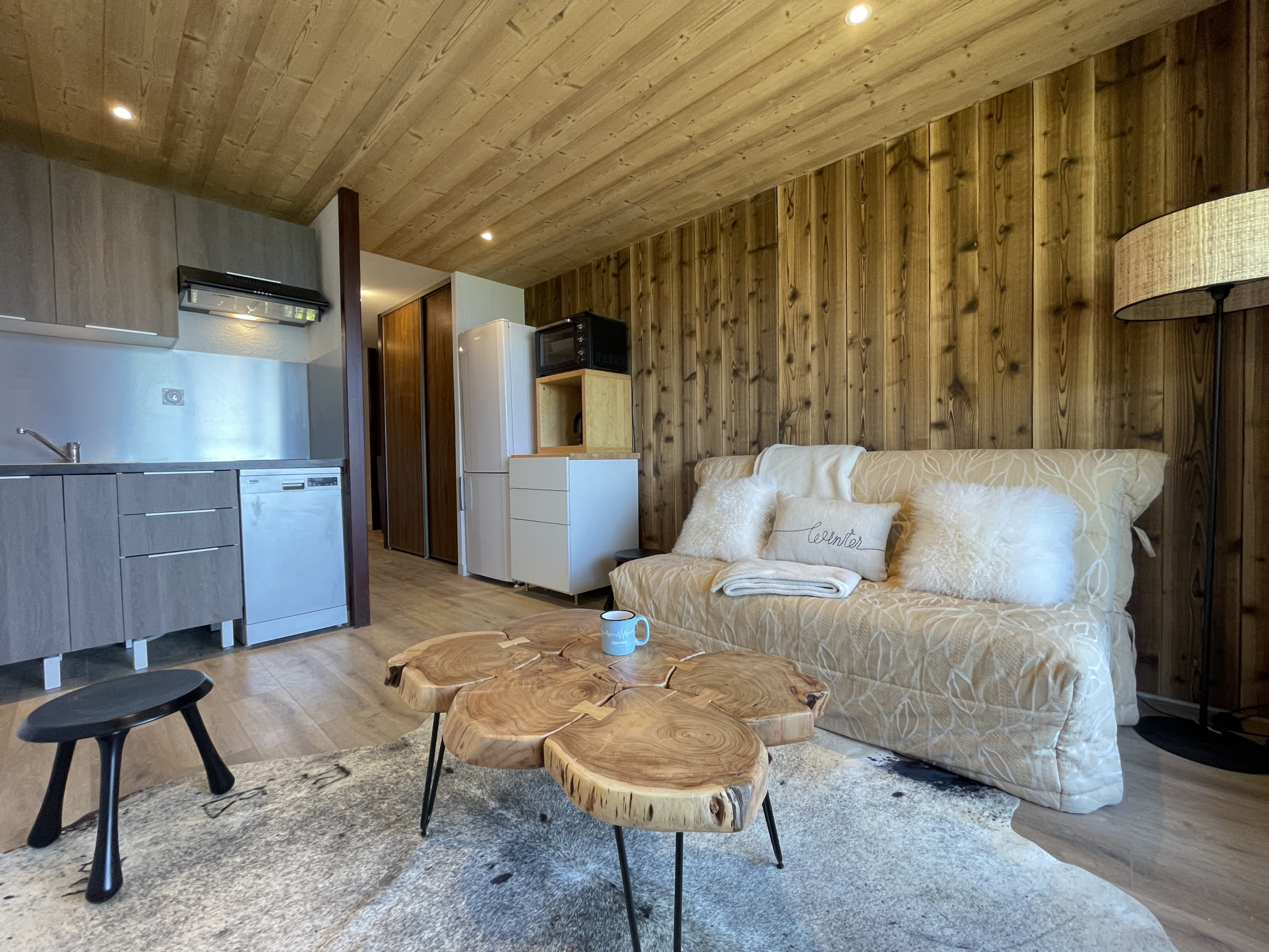 La pièce de vie est très confortable et possède un canapé convertible. Il est exposé Sud/Sud-ouest, et offre une magnifique vue sur les montagnes et un environnement paysagé et fleuri l’été. Cuisine neuve et équipée. Machine à laver dans la salle de bain.