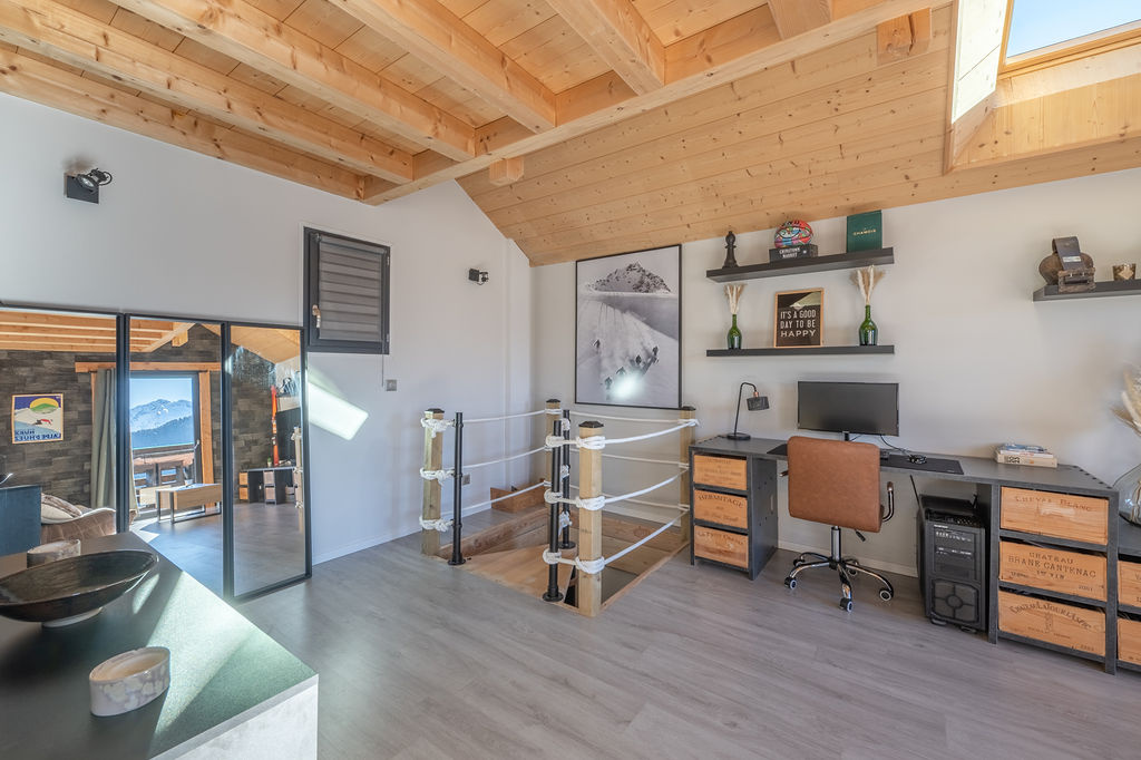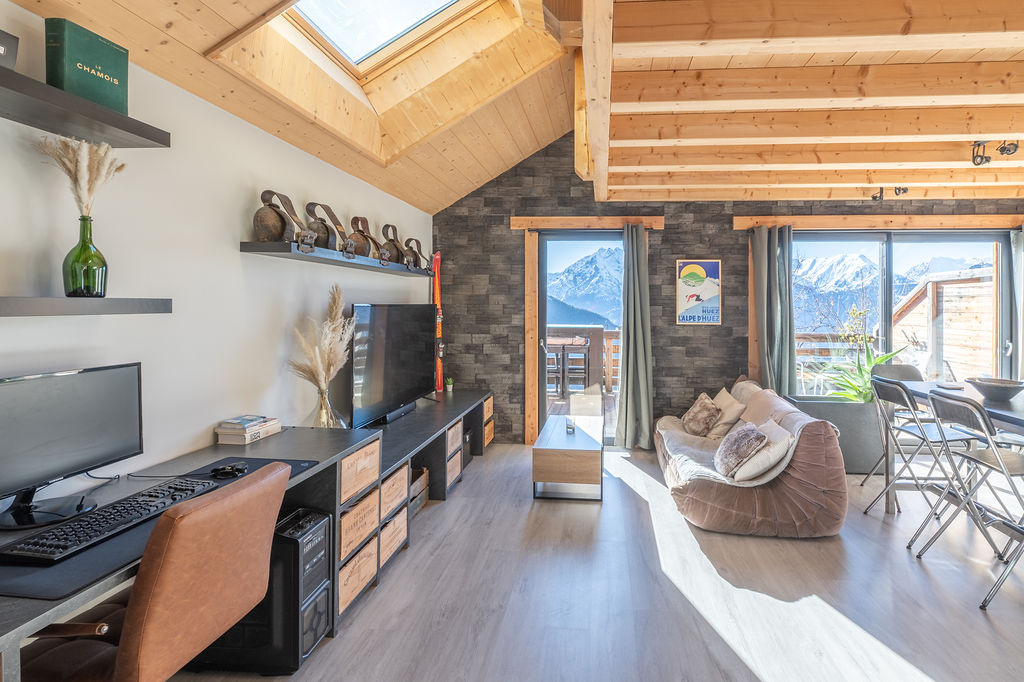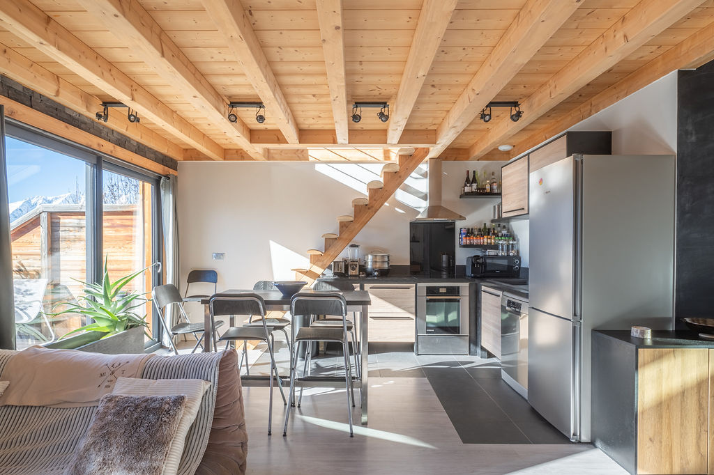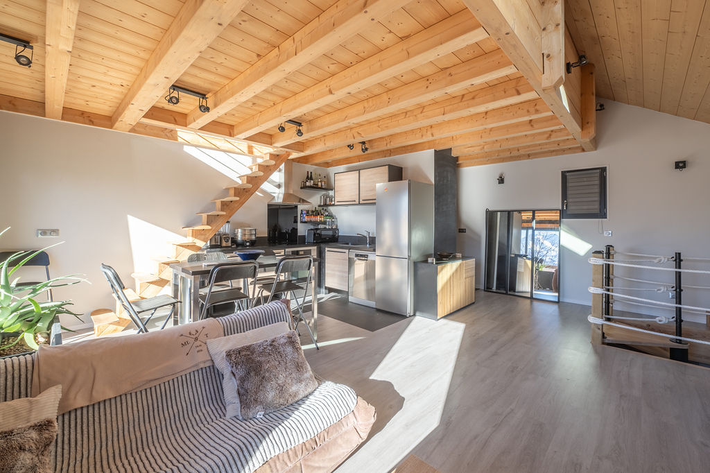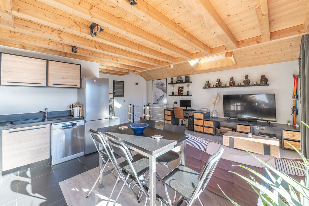 L’espace de vie, décoré avec soin dans une ambiance montagne et exposé plein Sud, s’ouvre sur une magnifique terrasse de 27m2 avec vue sur les massifs. La cuisine est entièrement équipée.