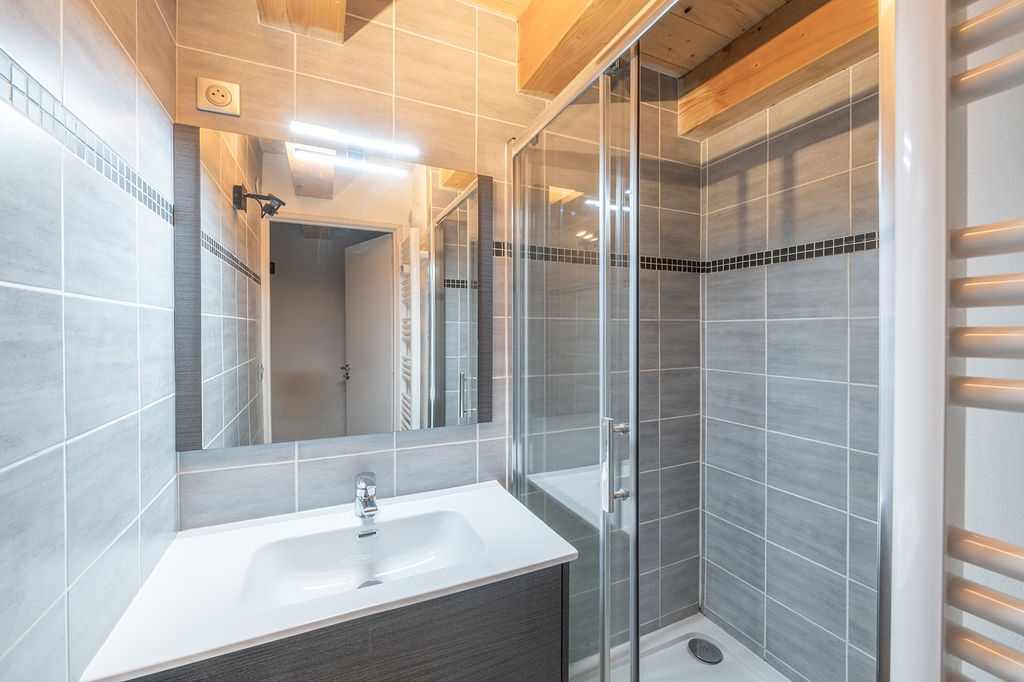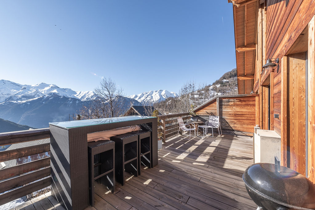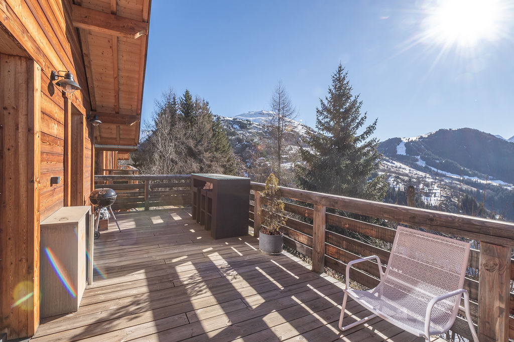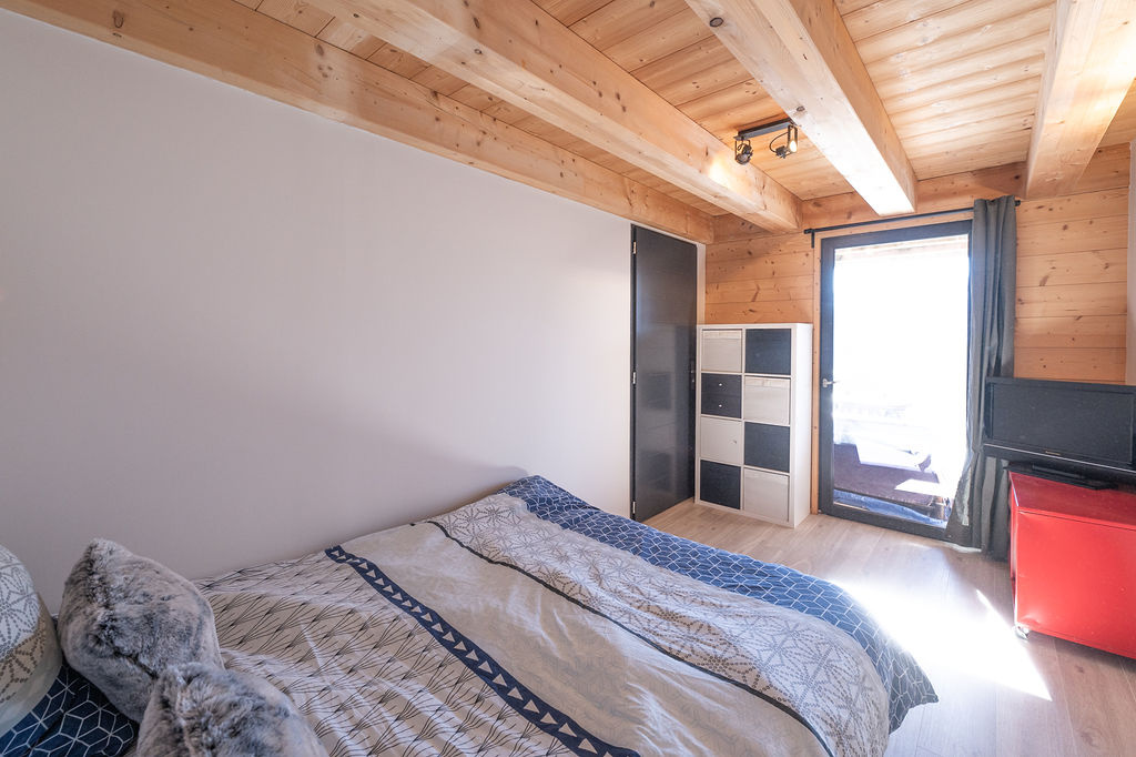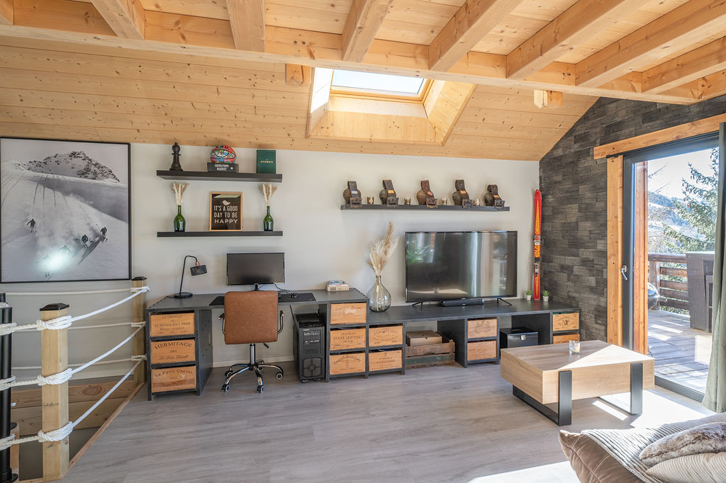 L’espace de vie, décoré avec soin dans une ambiance montagne et exposé plein Sud, s’ouvre sur une magnifique terrasse de 27m2 avec vue sur les massifs. La cuisine est entièrement équipée.