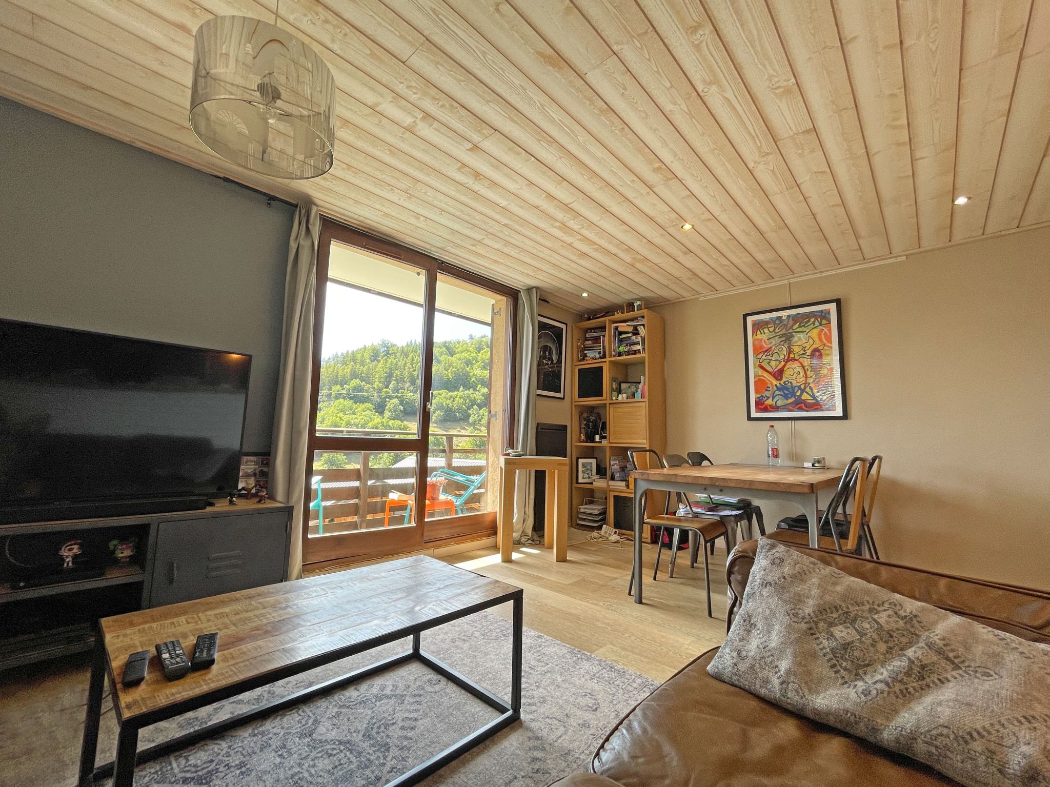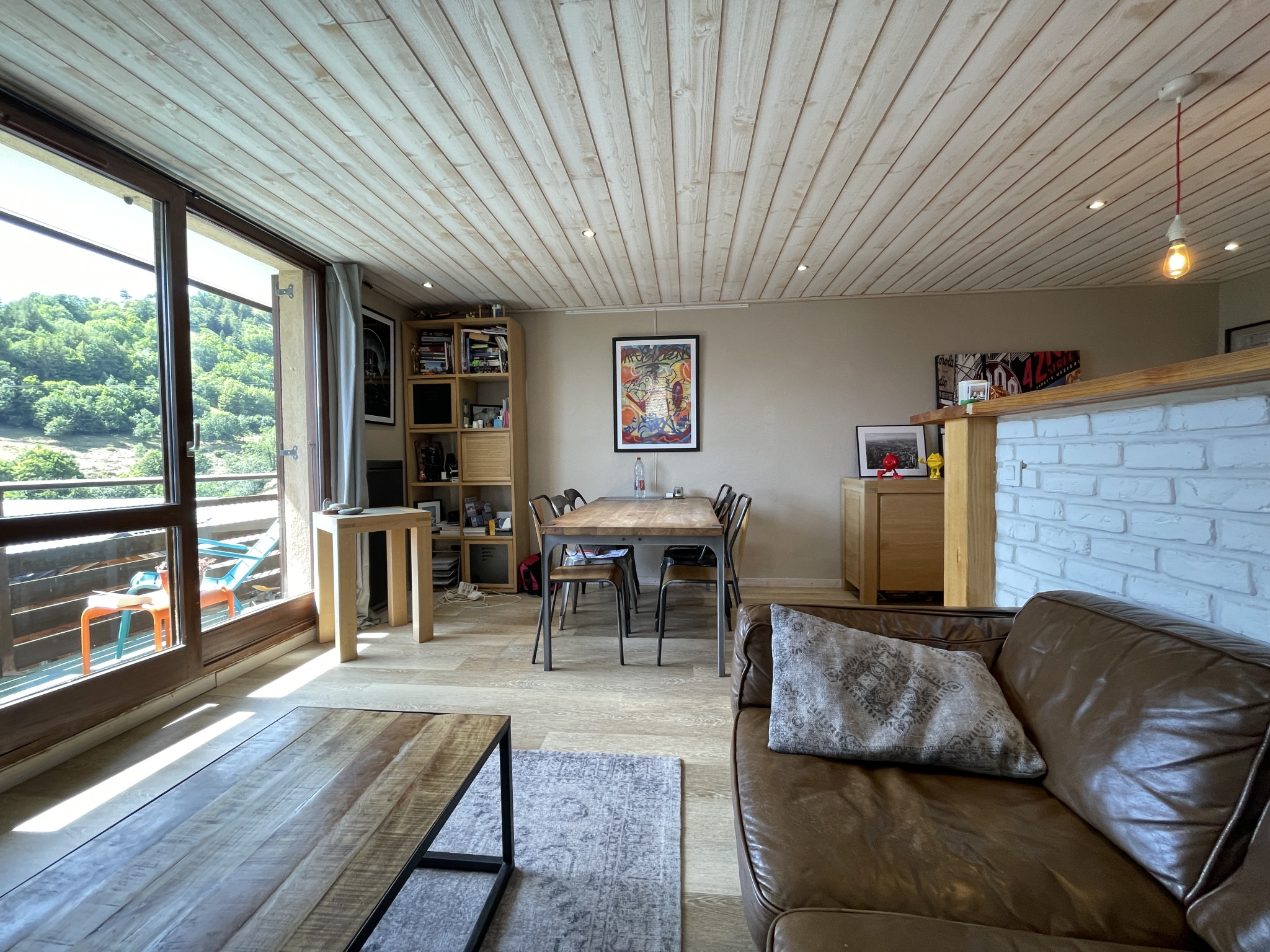 Le séjour de 35 m2 s’ouvre sur un balcon offrant une vue imprenable et dégagée sur les montagnes.